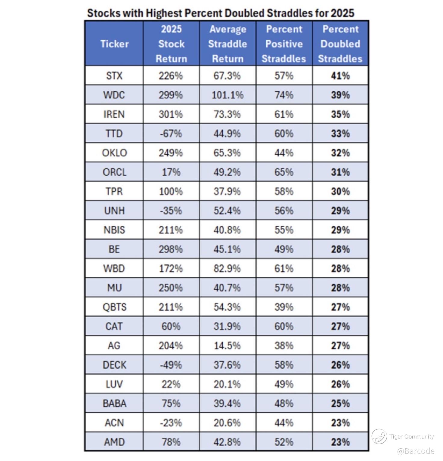 The list of stocks with the highest % of doubled straddles in 2025 confirms why equity volatility refused to collapse this year. Dispersion stayed elevated even as index returns looked smooth, rewarding volatility buyers in semis, AI, cyclicals, and select defensives.