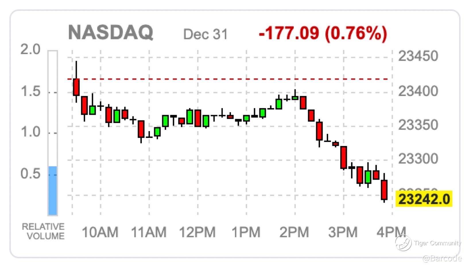 Markets closed red, with the $DJI, $SPX, and $IXIC logging a 4th straight daily loss. The Nasdaq slipped into the red for December, while the Dow notched its 8th straight monthly win. Still, all three capped a 3rd straight positive quarter and year, a classic late-cycle tell.