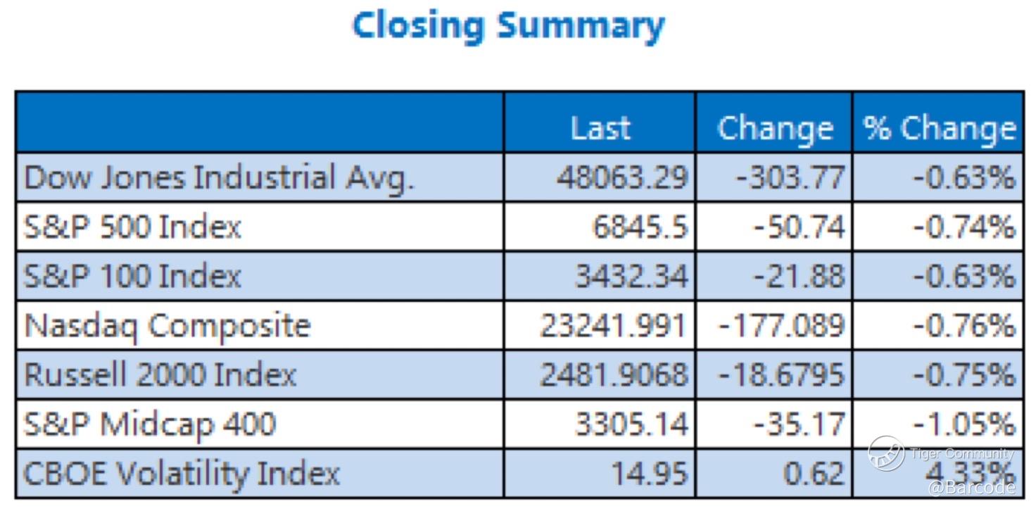 The S&P 500 closed at 6,845.50 (-0.74%), the Dow Jones Industrial Average at 48,063.29 (-0.63%), the Nasdaq Composite at 23,241.99 (-0.76%), and the Russell 2000 at 2,481.91 (-0.75%). Volatility firmed into the close, with the VIX ending near 14.95 (+4.33%), confirming active hedging as liquidity thinned.