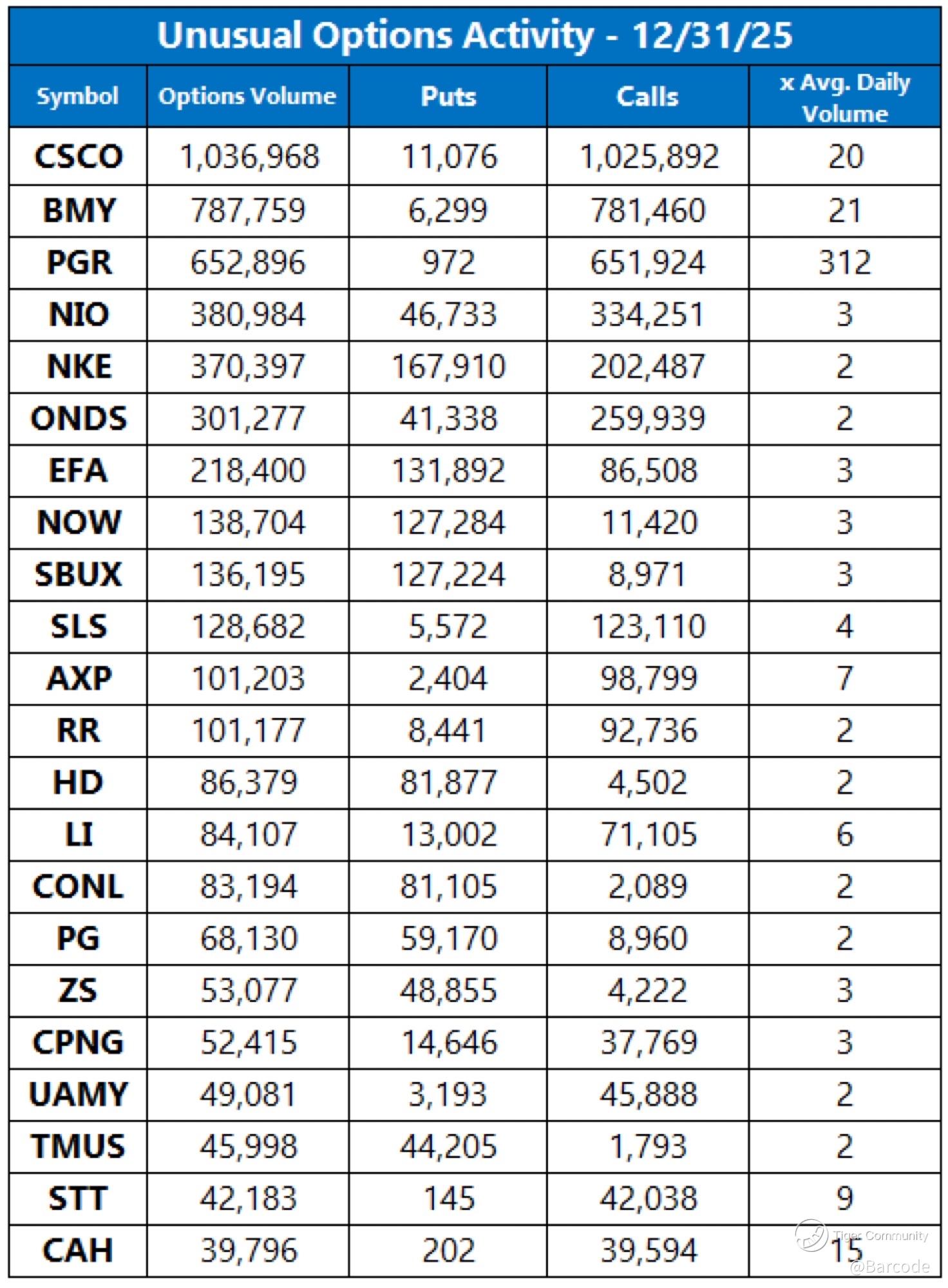 Todayβs unusual options activity (31Dec25) was dominated by positioning and hedging rather than outright panic. Several large-cap and growth names saw extreme call-heavy volume, while defensives and select tech names skewed put-heavy, consistent with year-end protection.