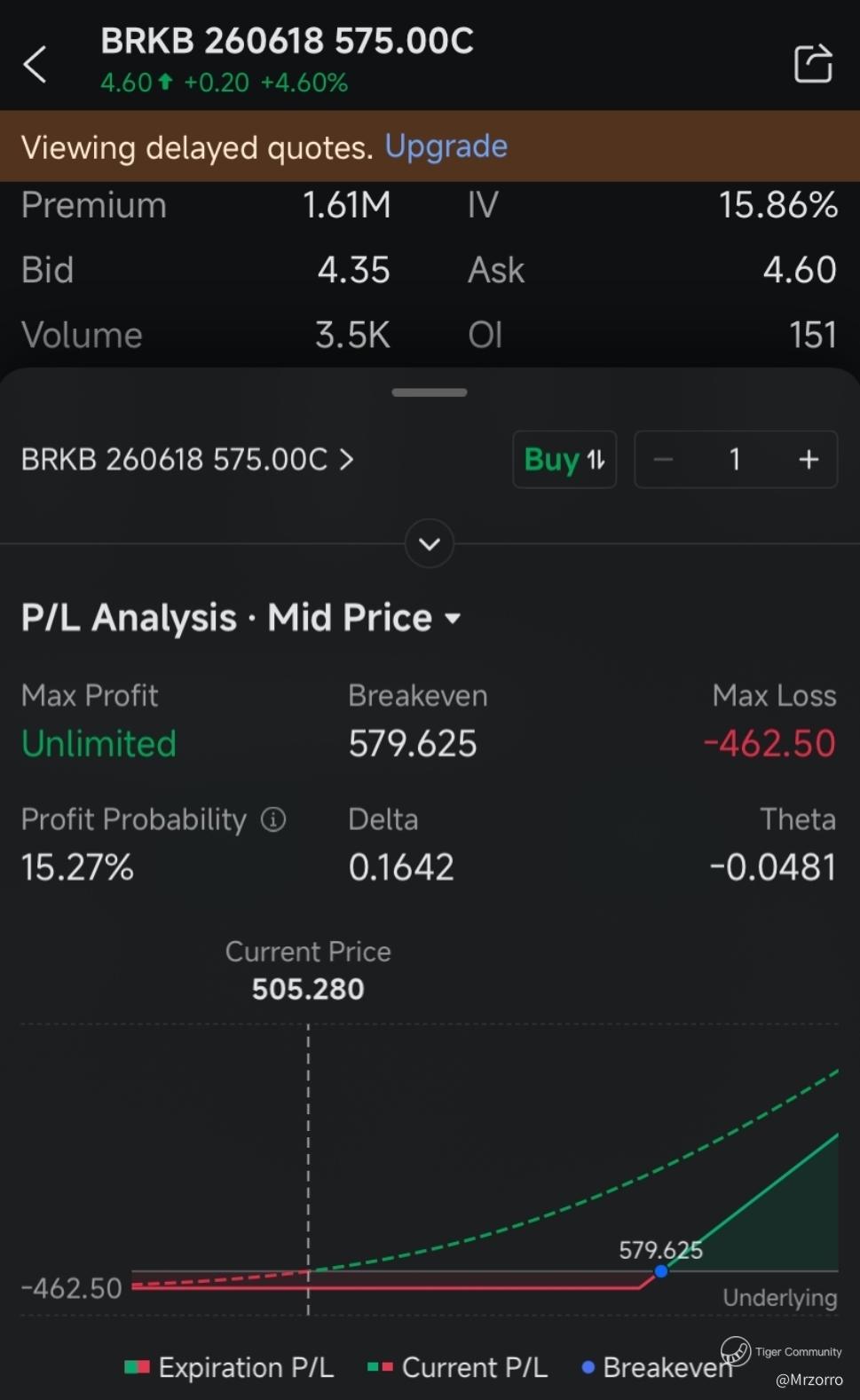 At 10:14:28 a.m. Wednesday, an active buyer paid a $1.61 million premium for call options that give their holder the right to purchase 350,000 Berkshire Class B shares at $575 over the next 168 days. That strike price is about $70 above the current stock price. The block trade is about 23X the open interest.