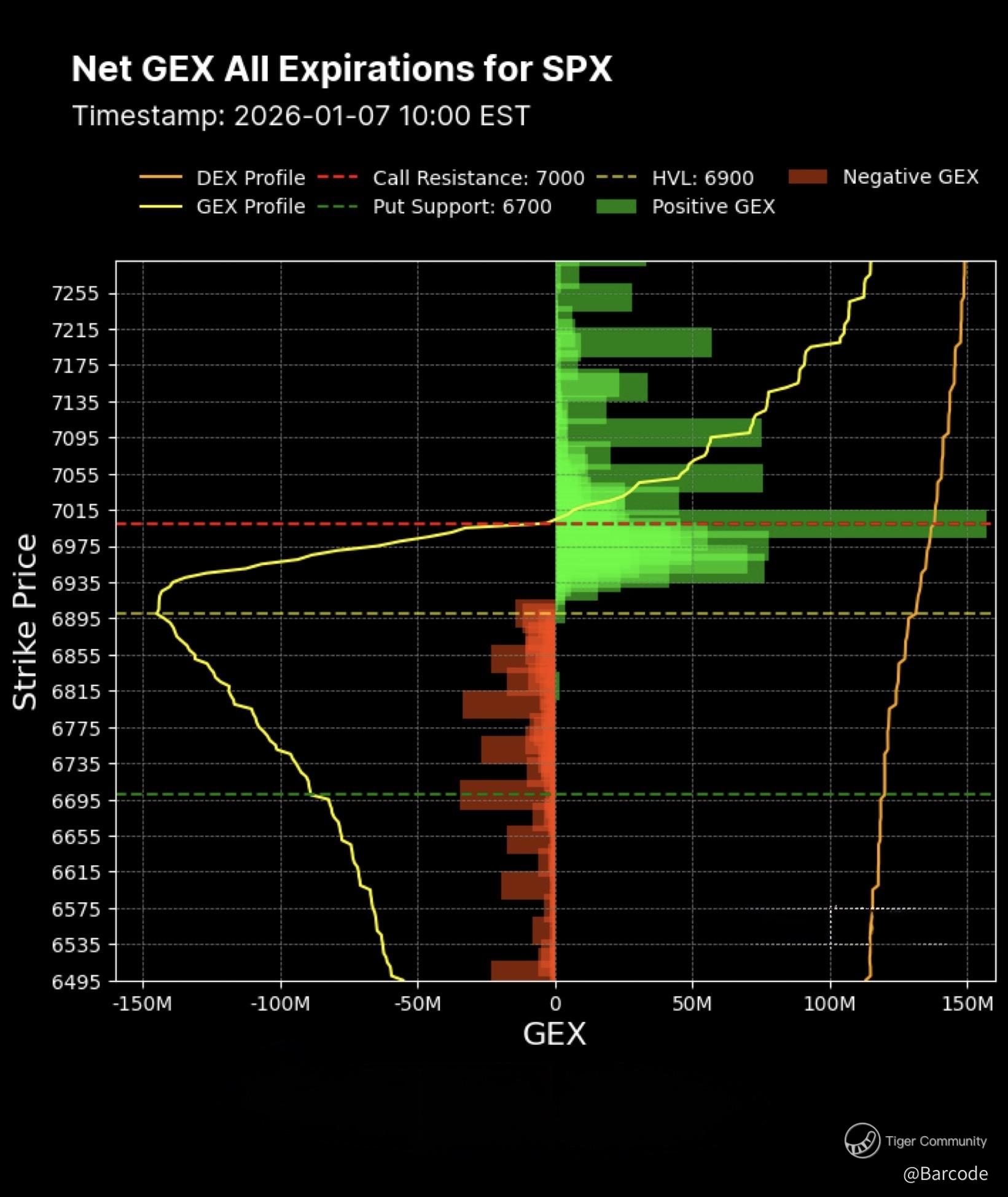 • 1-Day expected move: 6890.95 to 6998.09, 0DTE put support 6895, call resistance and gamma wall 6940, major call resistance 7000.