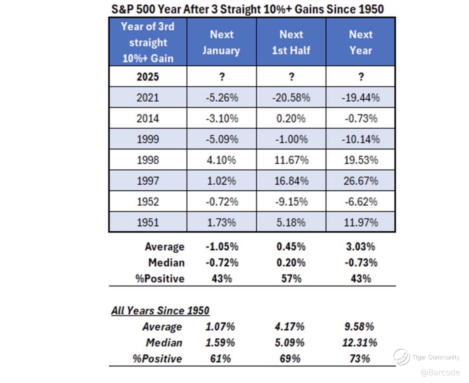 I’m treating the post-streak data as a warning label, not a prophecy. After three straight 10%+ years, January averages –1.05%, median –0.72%, and only 43% of Januarys are positive. The next full year averages +3.03%, and only 43% of those years finish green. That is materially below “all years since 1950,” where January averages +1.07%, the first half averages +4.17%, and the next year averages +9.58%, with 61%, 69%, and 73% positive rates respectively.