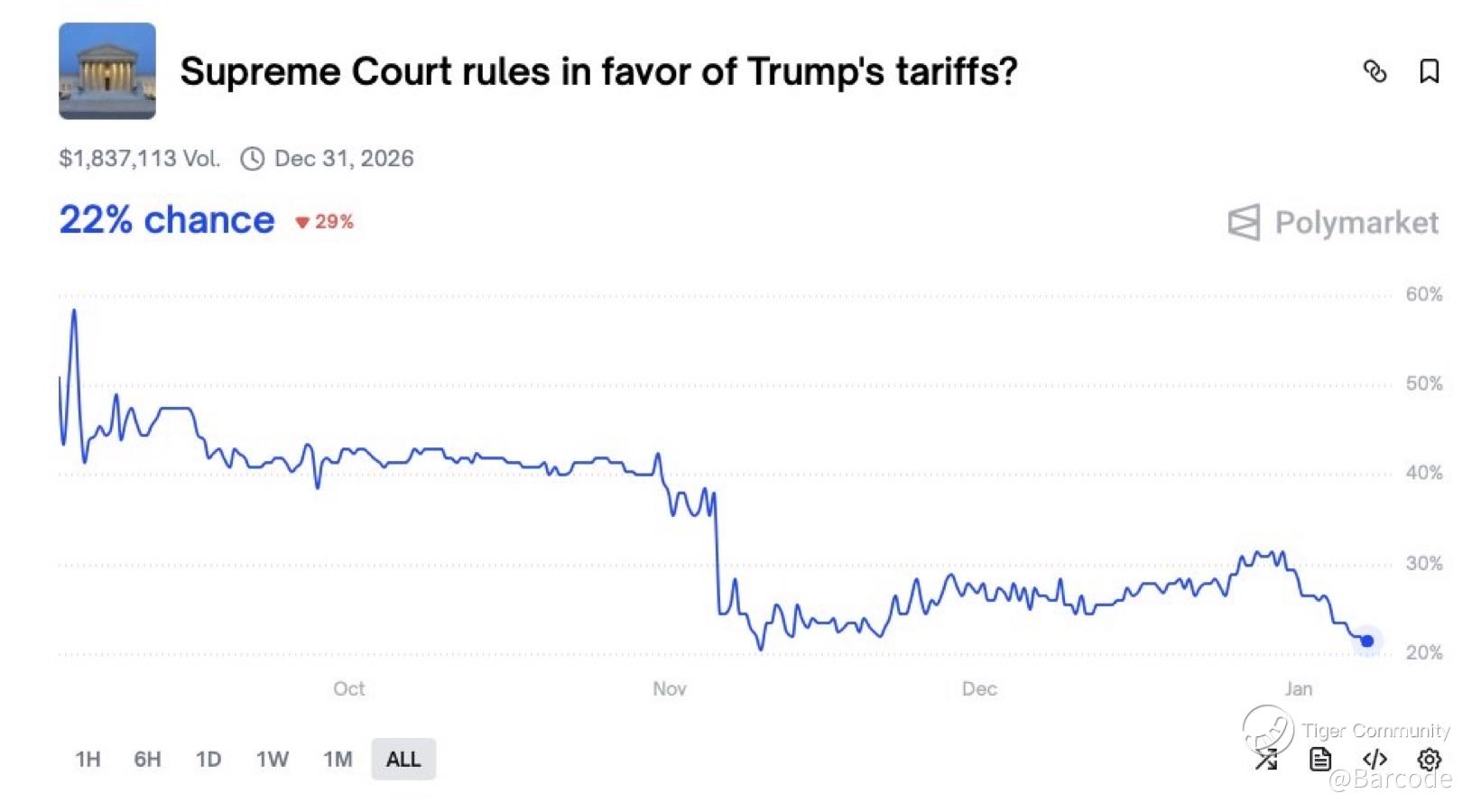 I’m flagging a major volatility catalyst ahead. Friday could be a major volatility event for global markets as the U.S. Supreme Court rules on President Trump’s tariffs. Polymarket currently shows just a 22% probability of the Supreme Court ruling in favour of the tariffs, setting the stage for a surprise outcome risk. This matters because low-probability events can hit hardest when positioning is rebuilt and volatility is compressed.