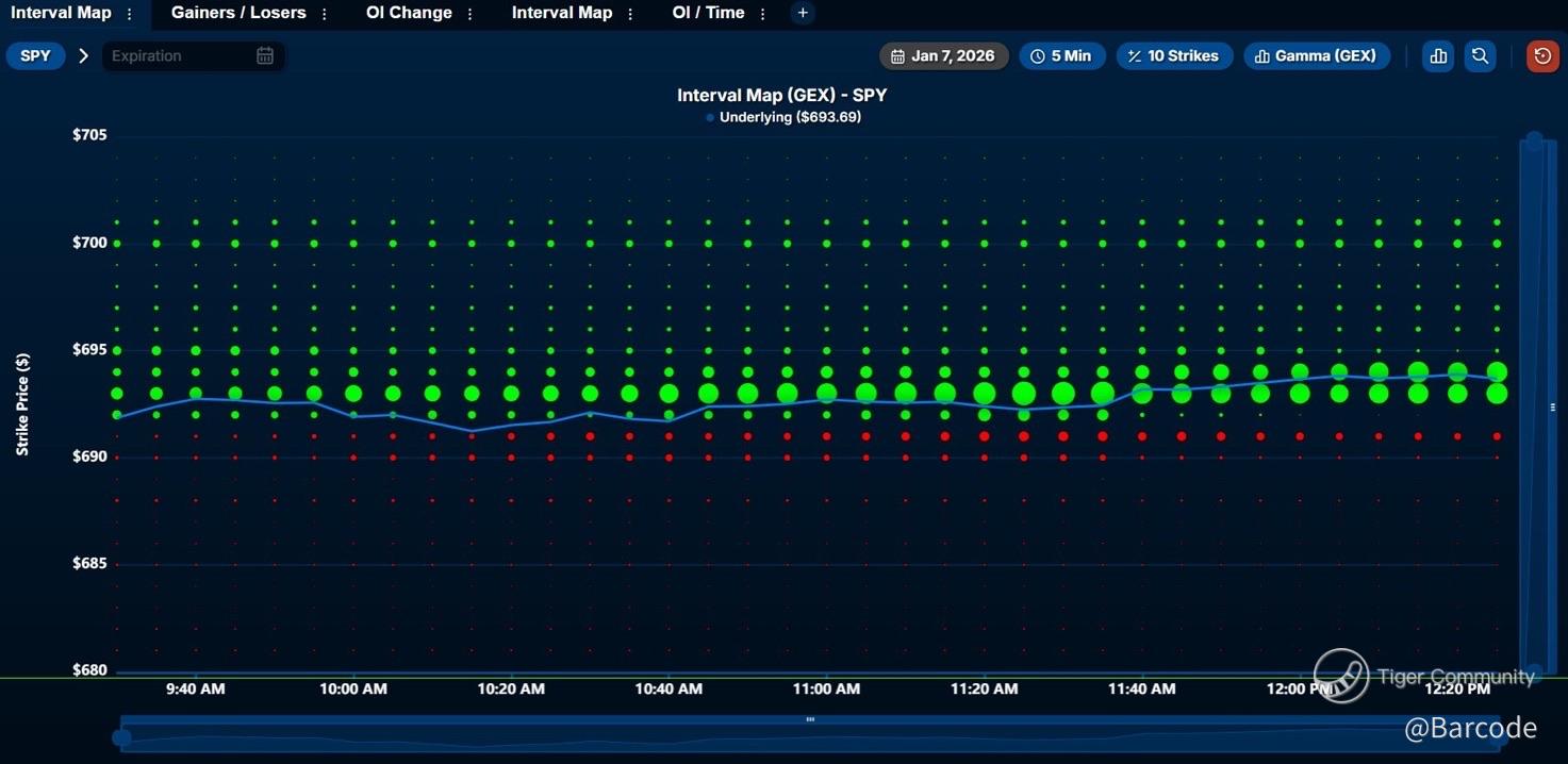 Nearly 8B in positive gamma exposure is stacked between $693–$694 on $SPY. With price flirting near ATHs, this kind of exposure typically dampens directional moves and encourages pinning. I don’t love pressing trades at all-time highs, and I’m still waiting to see if we get a clean rejection here. Might get it, might not. Patience matters at these levels.