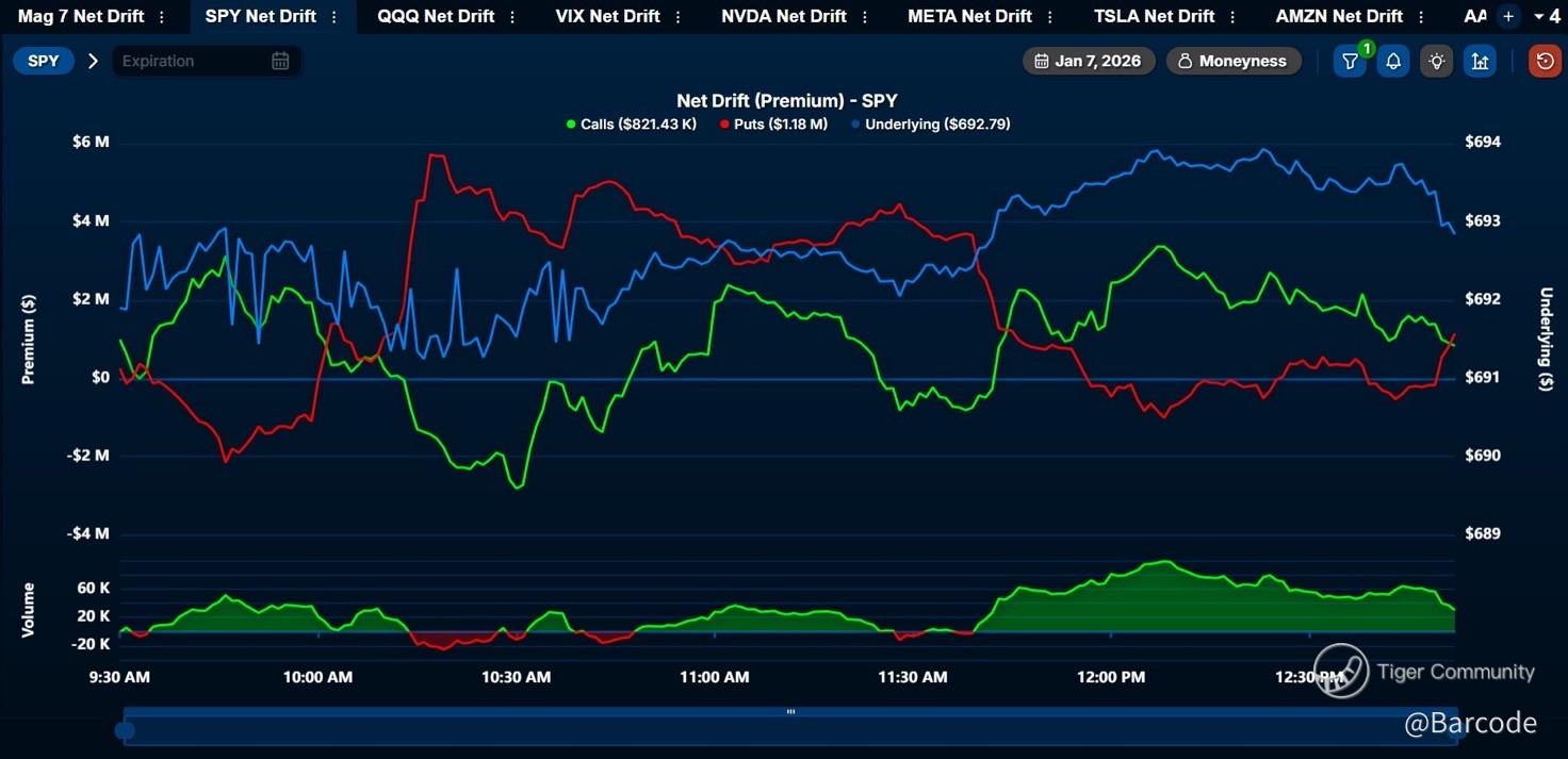 • $SPY: nearly 8B positive gamma stacked at $693–$694, pinning risk near ATHs, plus $SPY puts just crossed call again.