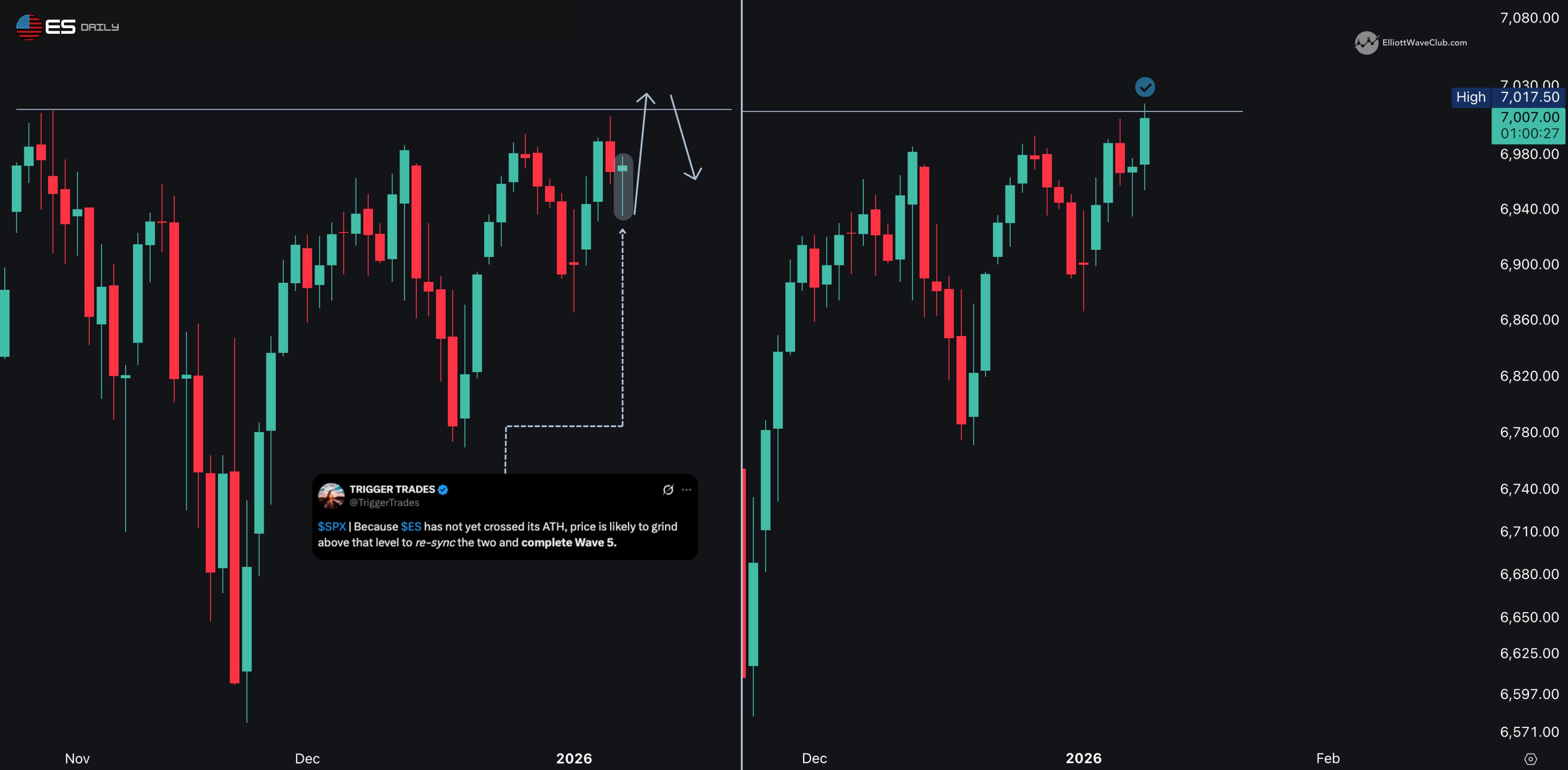 With $E-mini S&P 500 - main 2603(ESmain)$ printing a new all-time high as expected, $S&P 500(.SPX)$ + $ES are back in-sync.