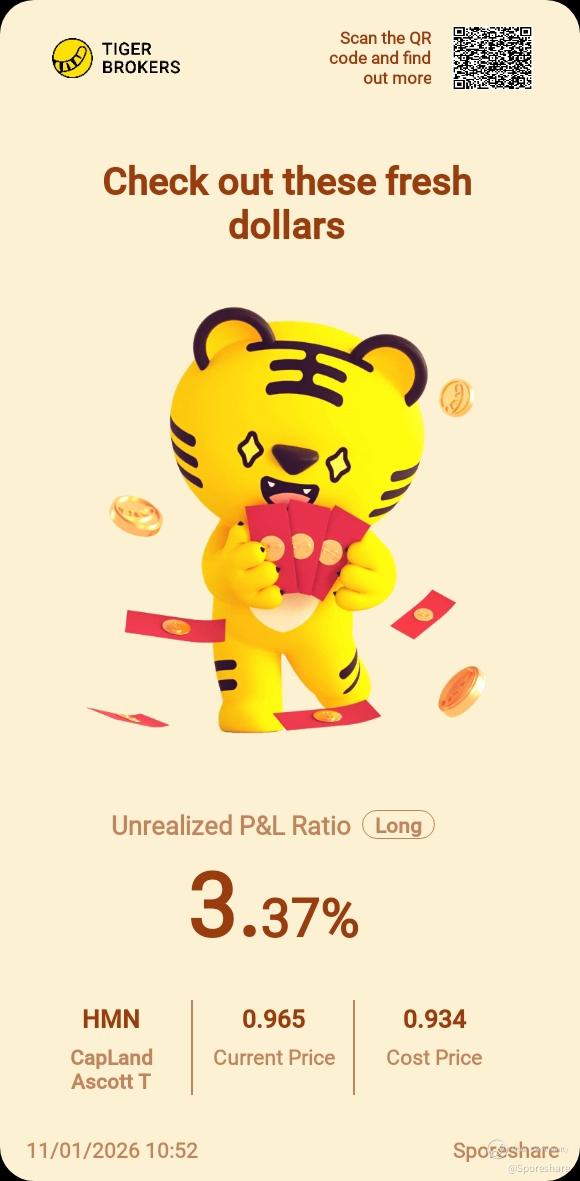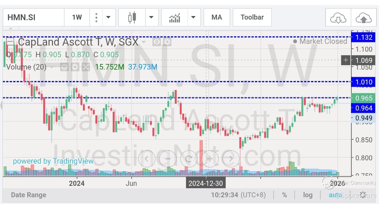 CapLand Ascott Tr - She has risen up nicely and closed well at 96.5 cents likely to continue to trend higher! Full Year results will be out on 29 Jan, dividend is coming, nice!