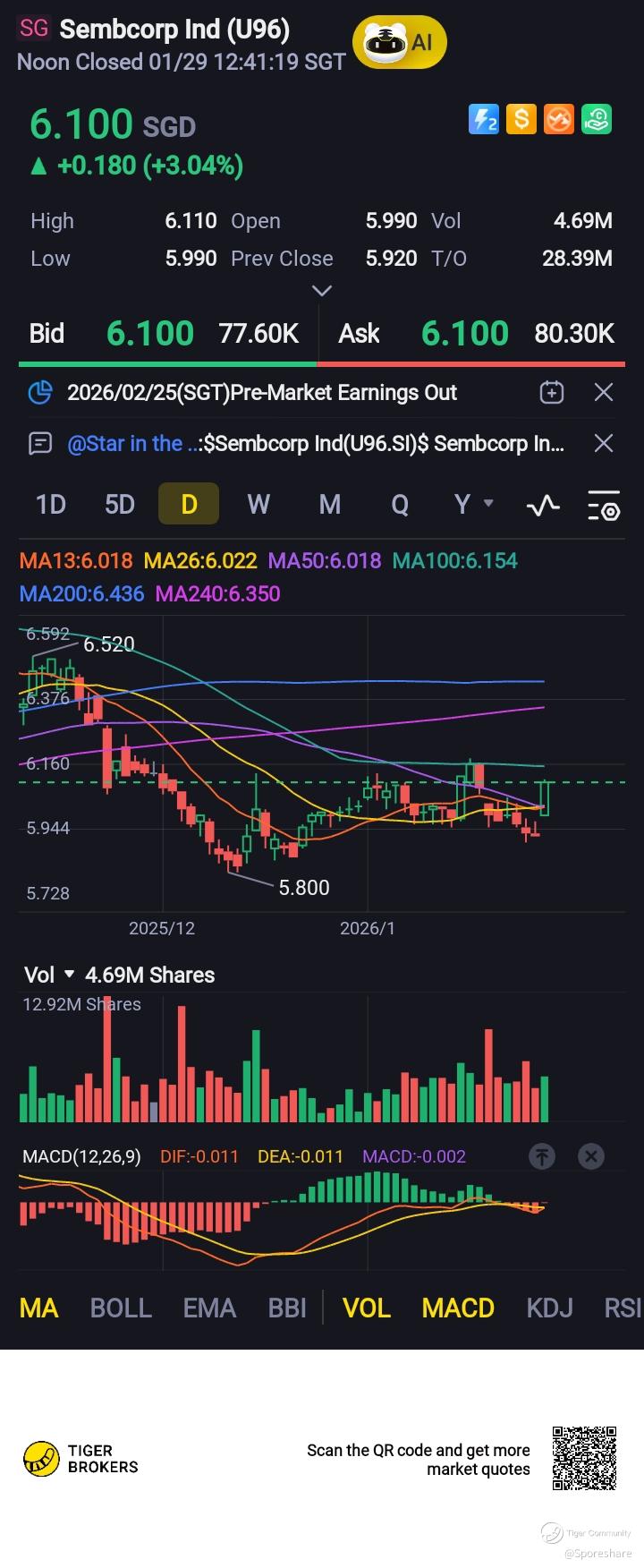 Sembcorp Ind - She is slowing rising up after touching the low of 5.80. Now trading at 6.04 looks rather interesting!