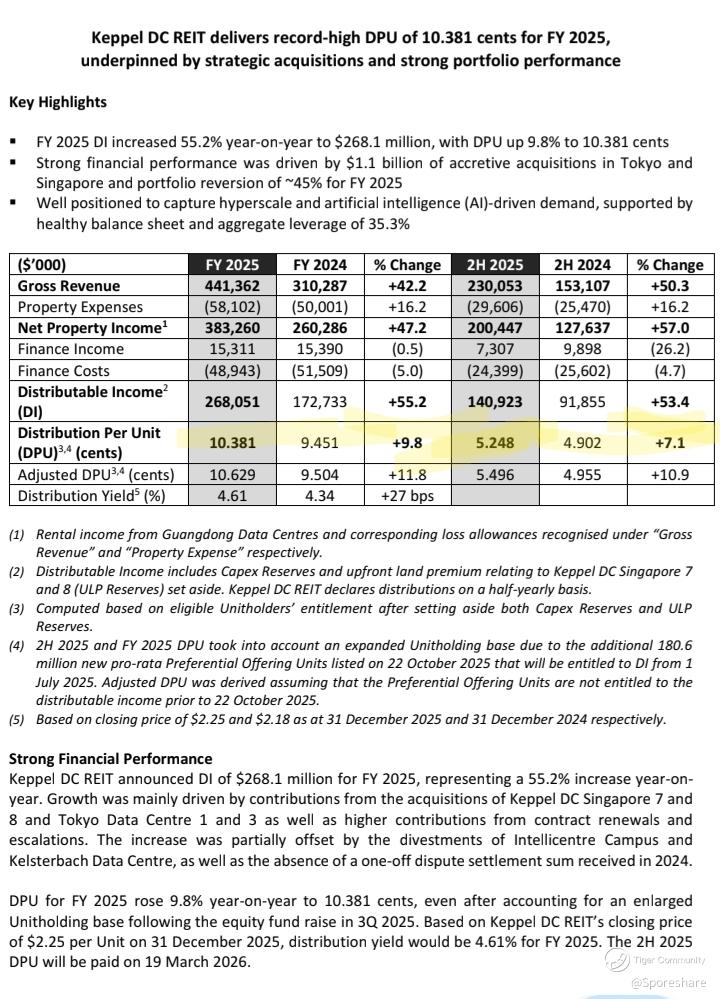 ▪ FY 2025 DI increased 55.2% year-on-year to $268.1 million, with DPU up 9.8% to 10.381 cents. 2nd Half Dpu is up 7.1% to 5.248 cents. XD 6 February.