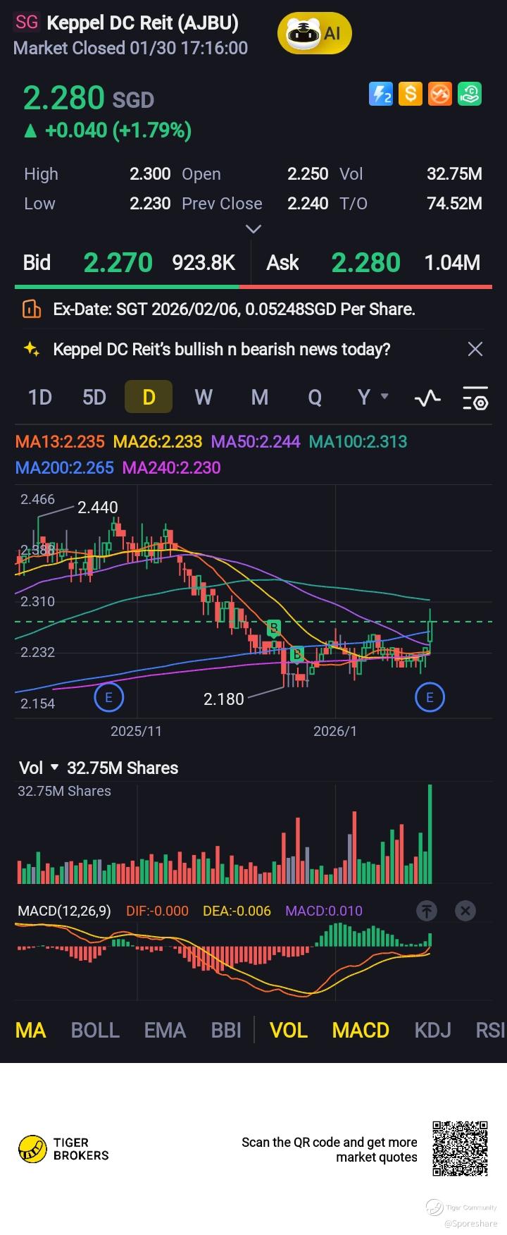 Keppel DC Reit - I think boat is back! Hovering at the support level of 2 28, yield is about 4.45 percent.