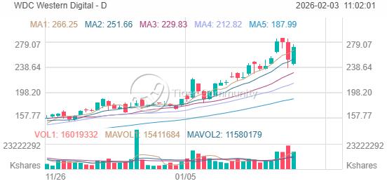 WDC closed at $270.23 on 2026-02-02, gaining +7.99% on the day. The stock is now within 5.3% of its 52-week high of $285.42.