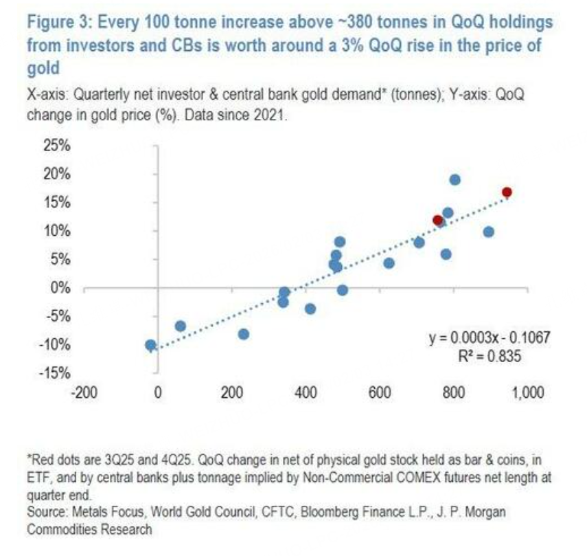 Goldman’s regression test is as follows: when the total amount of gold held by global institutions, individual investors, and central banks is above 380 tonnes, each additional 100 tonnes of holdings corresponds to roughly a 3% quarter-over-quarter increase in the gold price.