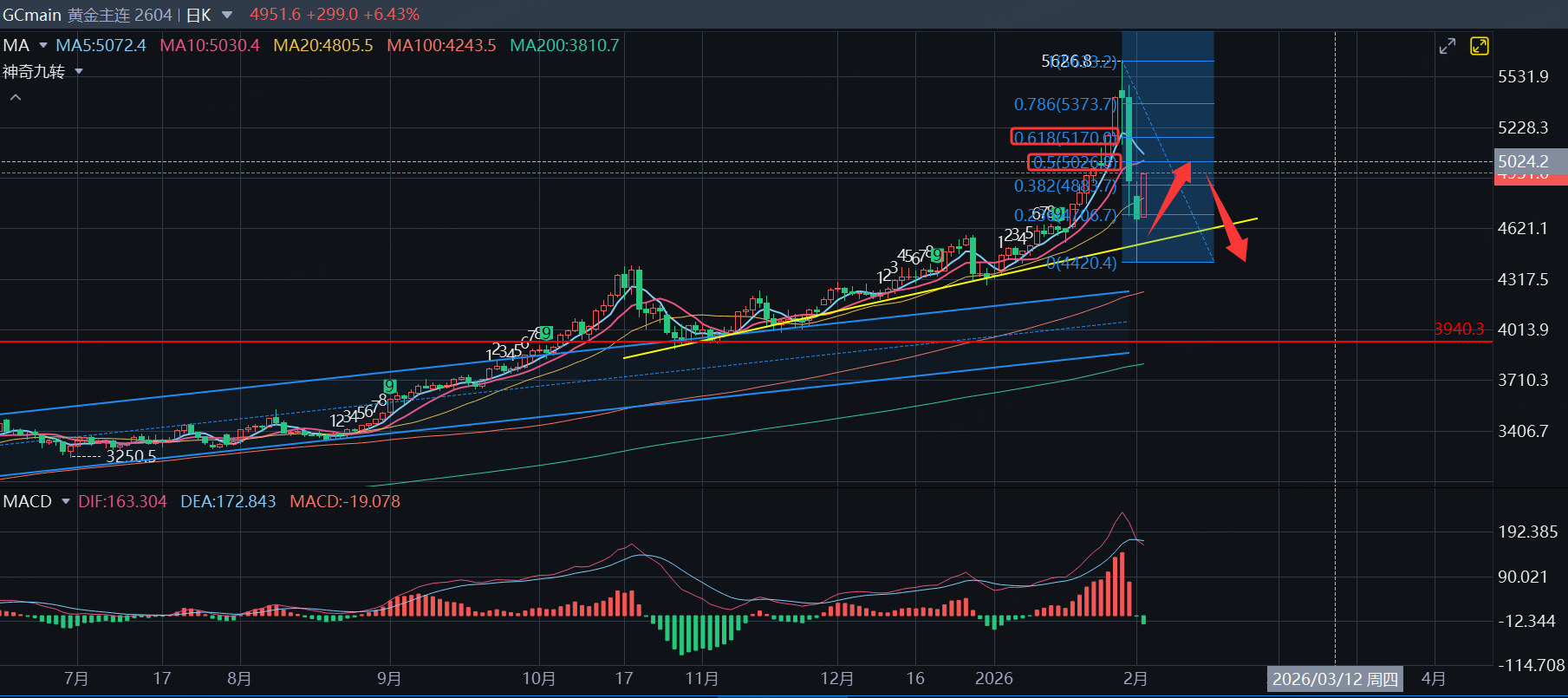 In addition, if the B-wave rebound exceeds the 0.618 Fibonacci retracement of the prior decline in gold—as shown in the chart—then COMEX gold 5183 can be treated as the key level corresponding to the “0.618 retracement.” Once that level is exceeded, the probability of a reversal rises materially; gold may still decline, but the likelihood of printing a fresh low decreases. This is the implication from technical theory.