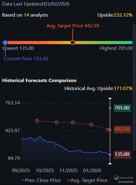 Based on 14 analysts from Tiger Brokers app offering 12 month price targets for Strategy in the last 3 months. The average price target is $442.59 with a high forecast of $705.00 and a low forecast of $135.00. The average price target represents a 232.12% change from the last price of $133.26.