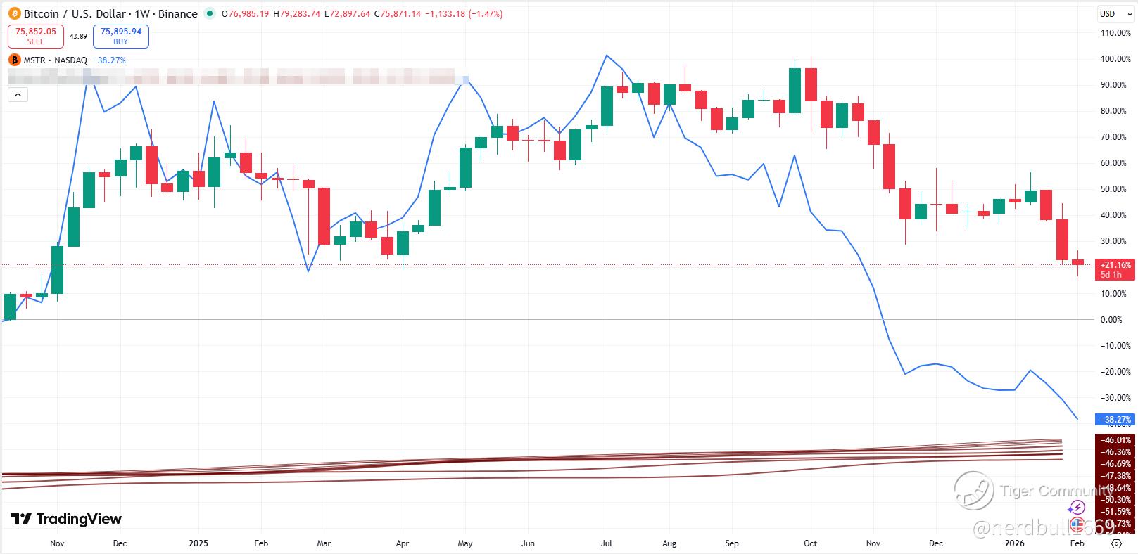 Amplified Volatility: MSTR acts as a "leveraged Bitcoin call option." It typically has a beta of 1.77× to 2× to Bitcoin. When Bitcoin drops (e.g., by 40% in late 2025), MSTR can drop much further (e.g., by 75%).