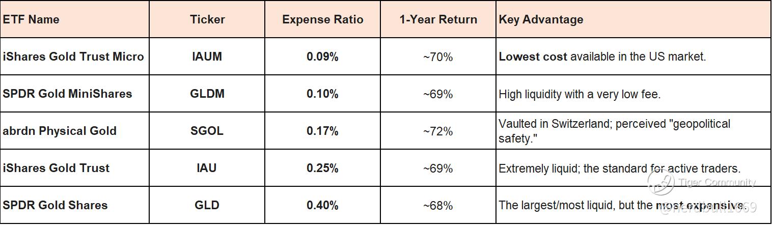For gold, the "mini" versions of major funds are currently the best value for individual investors, offering the same physical backing at a fraction of the cost.