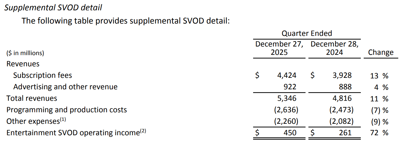 The streaming business is growing double-digits and has strong operating leverage, with operating income up 72% last quarter.