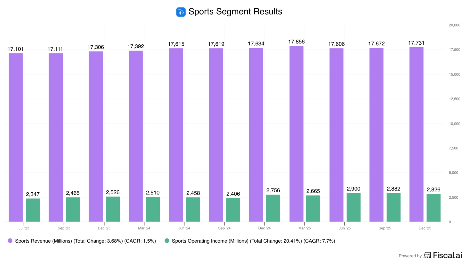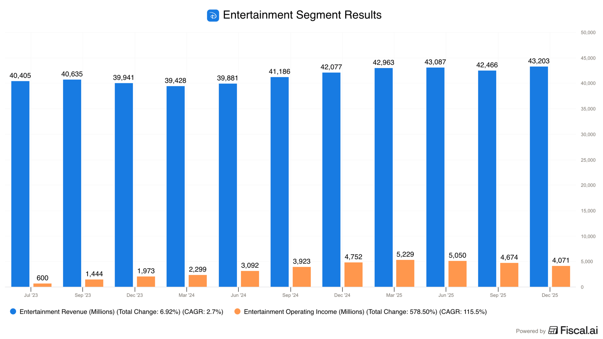 Unfortunately, Disney no longer breaks out results from studios, cable, and streaming, so we get this conglomerate look at the entertainment business overall.