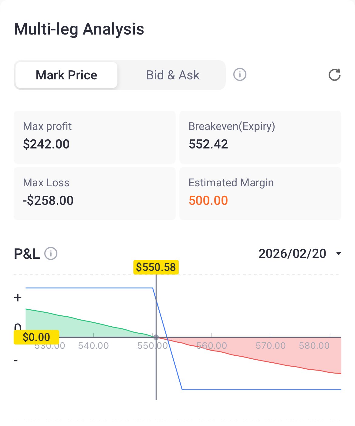Maximum profit: $242 per spread (if the stock is ≤ $550 at expiration)