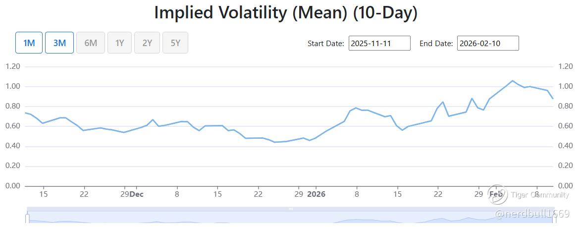 Moderna, Inc. (MRNA) had 10-Day Implied Volatility (Mean) of 0.8755 for 2026-02-10.