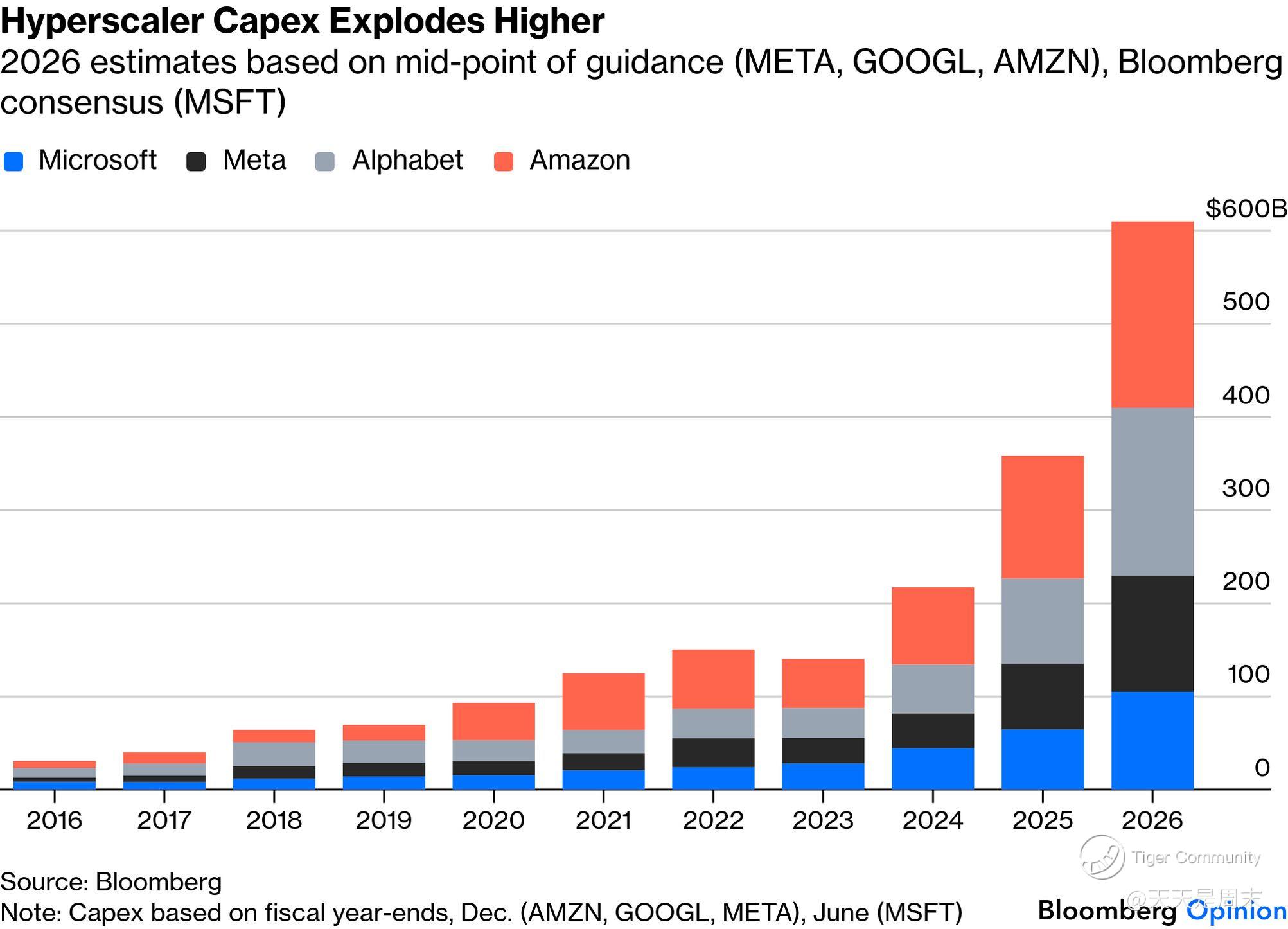 根據 Bloomberg 數據,2026年四大巨頭的 AI 基建投入將直衝 $6000億。