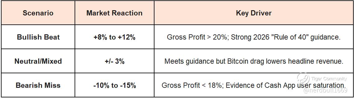 2. The Bitcoin "Noise" Fade (Bearish Risk) Bitcoin revenue is expected to decline (~$2.16B vs. $2.43B last year). While savvy investors look past this, the "headline miss" on total revenue due to lower BTC volume often causes an initial algorithmic dip. A quick trader might look to buy that initial dip if the underlying Square/Cash App gross profit numbers are actually strong.
