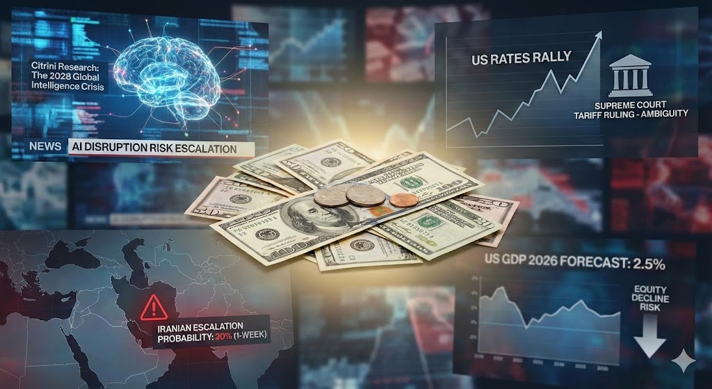 The US Dollar (USD) is currently navigating a highly complex macroeconomic and geopolitical landscape, with major financial institutions highlighting a triad of overarching risks. According to recent trading desk commentary [JPM], the primary driver (PC1) for macro markets, including interest rates and the dollar, is the sudden escalation of AI disruption risk. A widely circulated blog post by Citrini Research titled "The 2028 Global Intelligence Crisis" has sparked a massive retail-driven unwind in US equities, directly impacting market sentiment and currency flows [GS]. This tech-driven narrative has completely overshadowed traditional macroeconomic data, which continues to track positively but is largely deemed irrelevant by market participants at this juncture [JPM]. In addition to AI fears, the recent Supreme Court ruling on US tariffs has significantly altered the policy outlook. The ruling has lowered the expected average tariff rate but has concurrently injected a massive amount of ambiguity into the market as political rhetoric hardens [JPM]. Consequently, risk-off dynamics have taken hold, prompting a sharp rally in US rates as investors aggressively seek safe havens [GS].