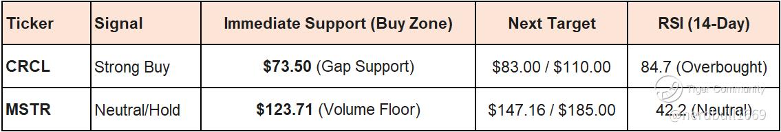 In the next section, we will analyse the technicals for Circle (CRCL) and MicroStrategy (MSTR) which reveals two very different setups: one is a "breakout" play with new momentum, while the other is a "mean reversion" play trying to find a floor.