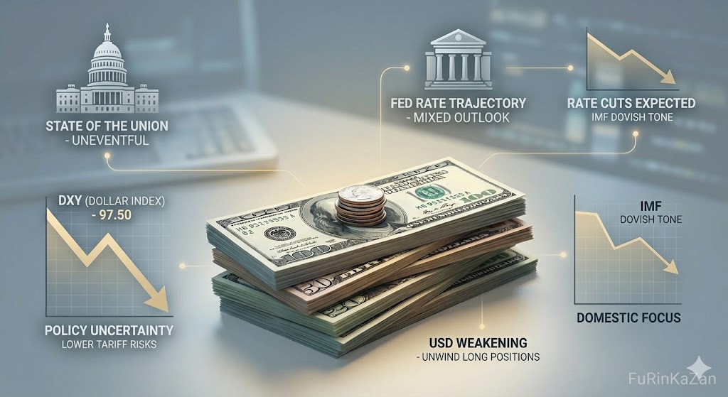 The US Dollar experienced a notable weakening across the board today, driven by an overarching sense of policy uncertainty and shifting expectations regarding the Federal Reserve's interest rate trajectory. The Dollar Index (DXY) retreated toward the 97.50 level as market participants digested an uncharacteristically uneventful State of the Union address by US President Donald Trump. According to MUFG, the lack of aggressive rhetoric regarding new tariffs during the speech suggests that the administration may be facing significant political constraints ahead of the mid-term elections. Trump's focus centered more on domestic priorities, such as lowering prices for consumers and pushing tech companies to shoulder data center costs, rather than escalating trade wars. This pivot has led analysts to reassess the immediate tail risks of sweeping tariff increases in 2026.