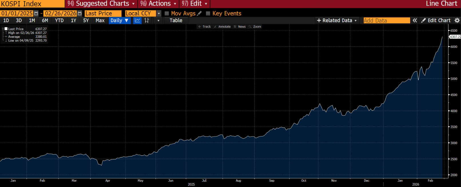 The KOSPI hit a fresh record above 6,300 today. After gaining more than 75% in 2025, the index has climbed another roughly 46% in less than two months in 2026. Total market capitalization has surpassed $3.76 trillion, overtaking Germany and France to become the world’s ninth-largest equity market.