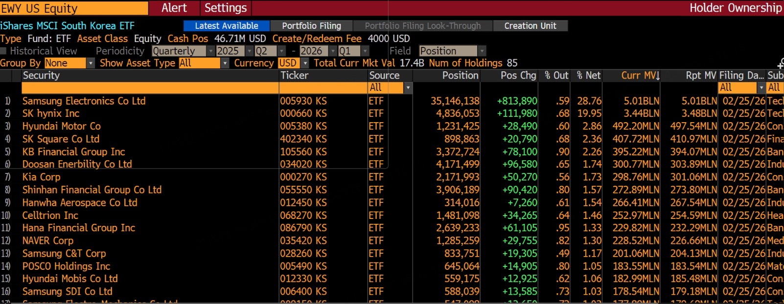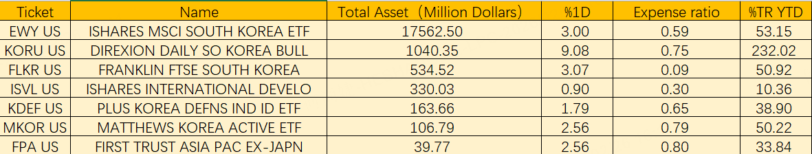 $iShares MSCI South Korea ETF(EWY)$ has assets under management of approximately $17.56 billion, making it the largest broad-based Korea ETF. It charges a management fee of 0.59% and has gained 53.15% year-to-date. Its holdings primarily track fluctuations in the weightings of Samsung and SK Hynix.