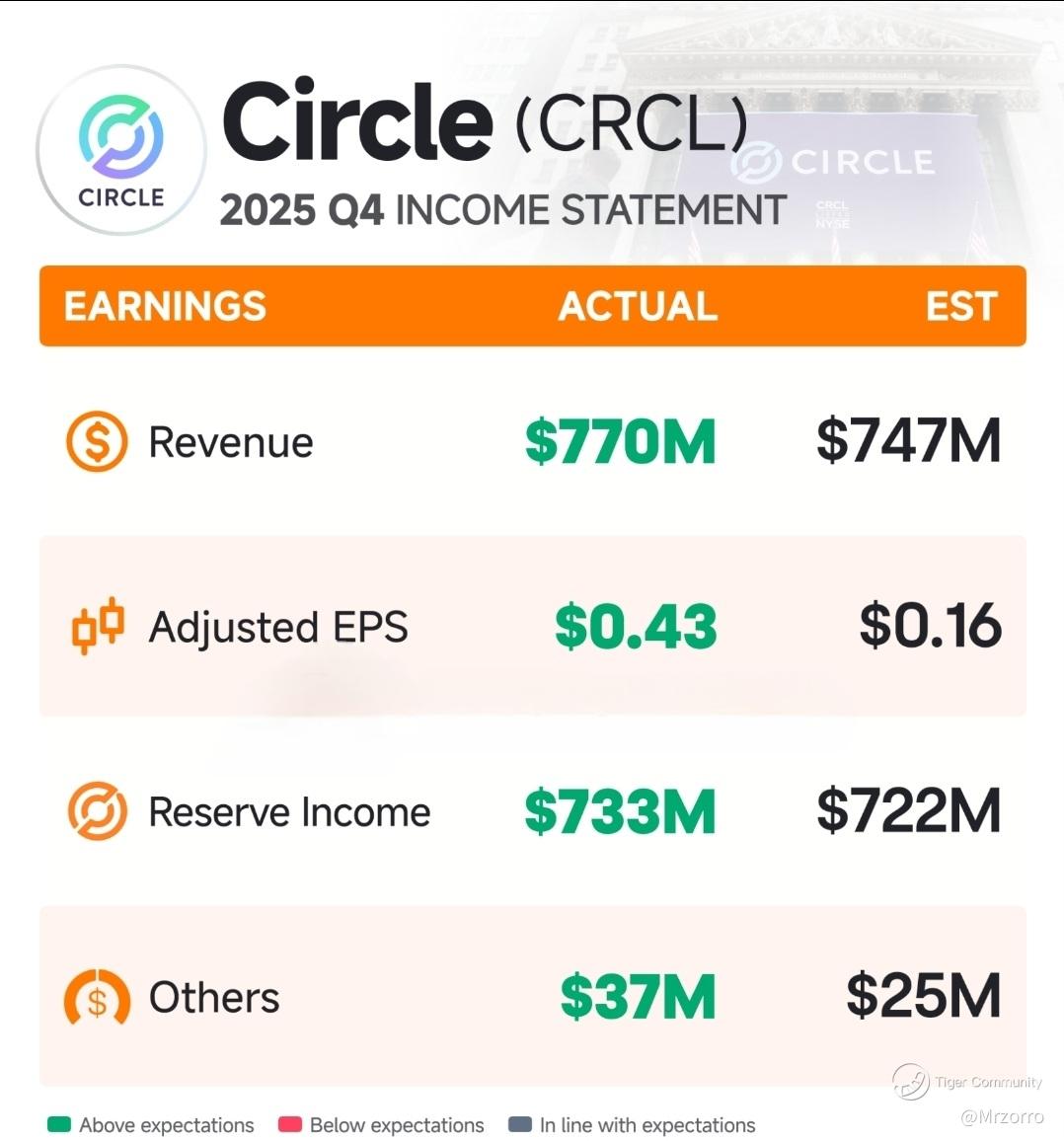 $Circle Internet Corp.(CRCL)$ , the issuer of the USDC stablecoin, delivered stellar results for the fourth quarter (Q4) of 2025. The report highlighted the company's business resilience and directly drove a 35.47% surge in CRCL shares on February 25, 2026, triggering a broad-based rebound across the crypto sector.