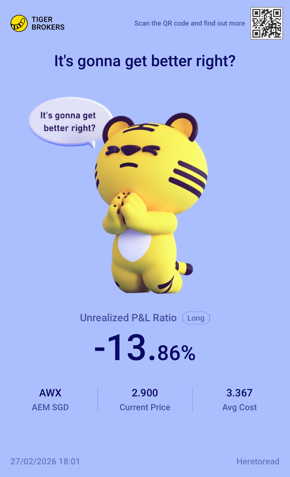 $AEM SGD(AWX.SI)$  price when up by a lot but not near the all time high. Hope with the new management , this stock will be a good performer . Happy to see They declared a dividend and have significant Contribution from a brand new customer which should help it to diversify the single counter party risk