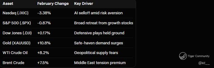 February flipped the script on markets like a thriller plot twist β from AI hype to full-blown safe-haven scramble amid escalating Iran tensions. Tech-heavy indexes took a hit as investors fled to gold and oil for cover. Nasdaq plunged 3.38%, S&P 500 dipped 0.87%, while Dow eked out a slim 0.17% gain. But the real stars? Gold rocketed nearly 11% to hover around $5,296, and oil spiked to $72+ per barrel on fears of supply chaos. π²