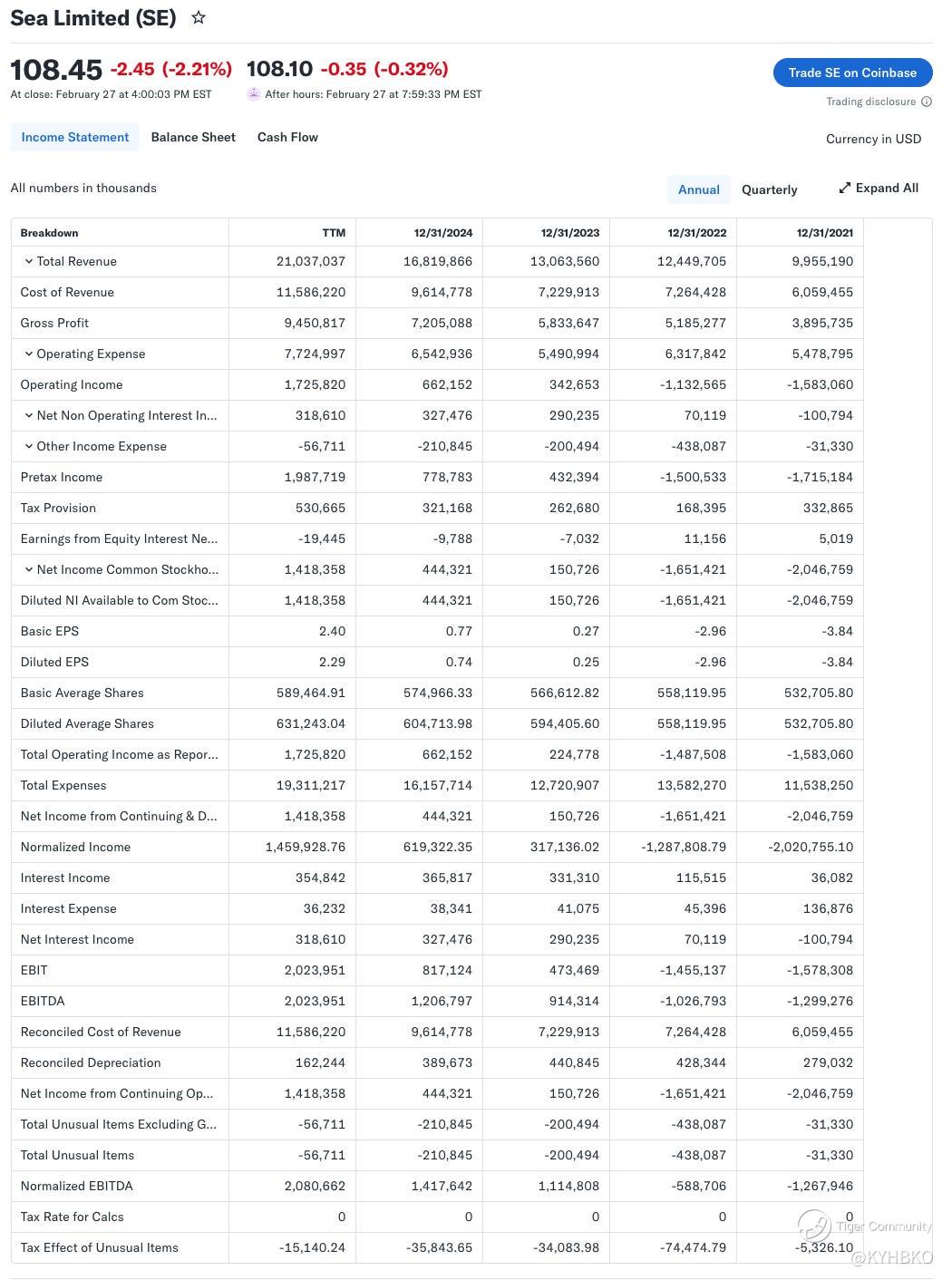 Gross profit also increased significantly, with the year ending 2021 showing $3.9 billion and the TTM gross profit reaching $9.4 billion. This indicates robust and sustained growth in profitability. Operating income for 2021 reflected a $1.5 billion loss, but the TTM figure has shifted to an operating profit of $1.7 billion. Sea Limited has reported net profits for the last three financial years.