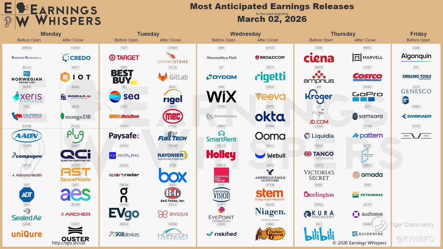 I am interested in the earnings of Target, CrowdStrike, Sea, Broadcom, Costco, Kroger and Kura.