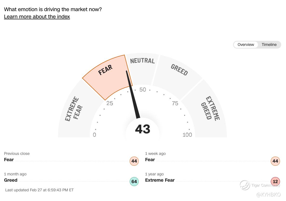 The CNN Fear and Greed Index currently registers a score of 43, indicating that market sentiment is predominantly influenced by fear. This level suggests that investors are showing caution, and fear is playing a significant role in recent market movements. The index, which measures various market indicators to gauge overall investor emotion, reflects a cautious environment where negative sentiment may be impacting trading decisions and contributing to the broader market outlook.
