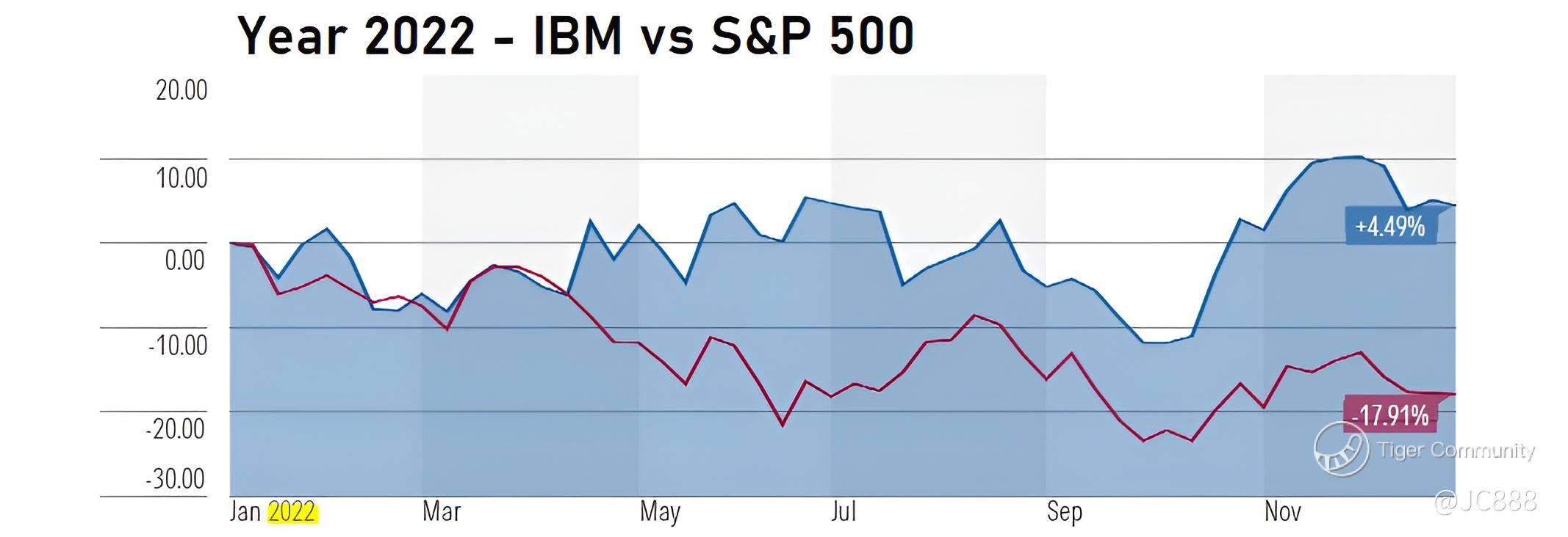 During 2022 inflation shock, IBM dropped -20.2% from peak to trough vs the S&P 500's +25.4%. Miraculously, it fully recovered by November 2022. (see above)
