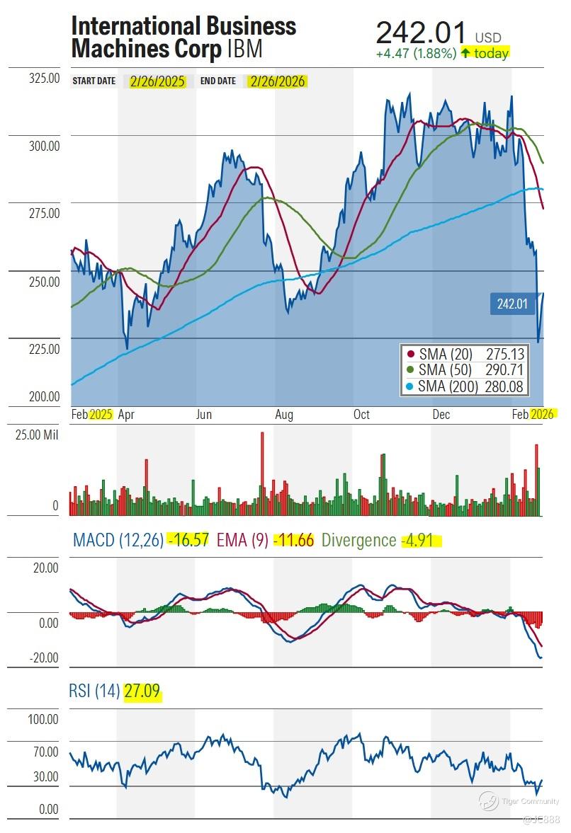 IBM’s stock price recovered well, gaining a total of +8.13% between Feb 24 - 26, reflecting a positive shift following earlier market fluctuations.