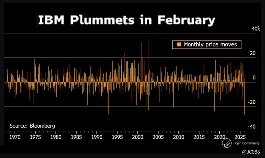 With the decline, IBM shares have fallen -27% in February 2026 (alone), on track for its biggest one-month slide since at least 1968, according to data compiled by Bloomberg. (see above)