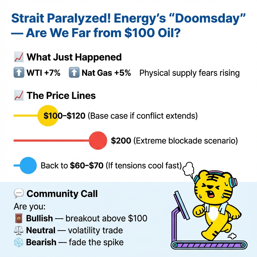 $WTI Crude Oil - main 2604(CLmain)$ surged 7% today, touching $76 in premarket trading. $Natural Gas - main 2604(NGmain)$ jumped nearly 5% in a single session, while precious metals lagged behind. The real eye of the storm lies in the Strait of Hormuz — the choke point of global energy supply is being squeezed.
