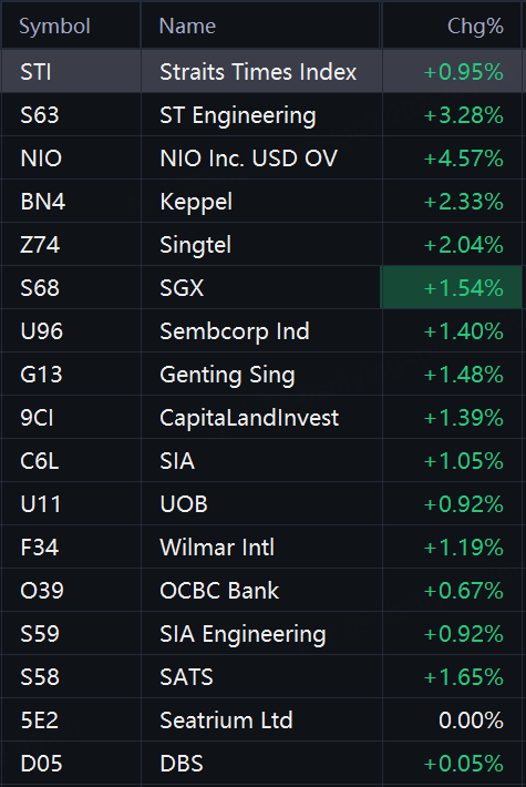 Singapore stocks opened higher on Thursday. STI rose 1%; NIO rose 5%; ST Engineering rose 3%; Kepple, SIngtel, and SGX rose 2%; Genting Singapore, Sembcorp, and SIA rose 1%; UOB rose 0.9%; OCBC rose 0.7%; DBS rose 0.1%.