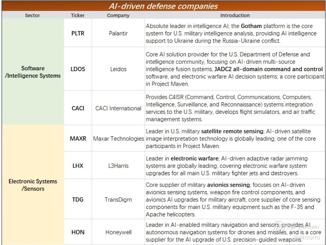 Meanwhile, the AI-ification of defense companies not only requires combat assistance software systems from companies like Palantir but has also led to a surge in hardware demands such as sensors, navigation, and electronic control systems.$L3Harris Technologies, Inc.(LHX)$ ,$TransDigm(TDG)$ ,and $RTX Corp (RTX.US)$ Raytheon Technologies are major players in this field. Other relevant information is as chart belows: