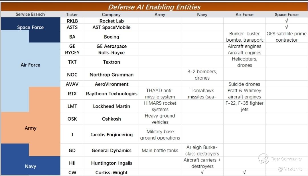 Dividing by Space Force, Navy, Army, and Air Force, the product lines of various companies are as follows chart: