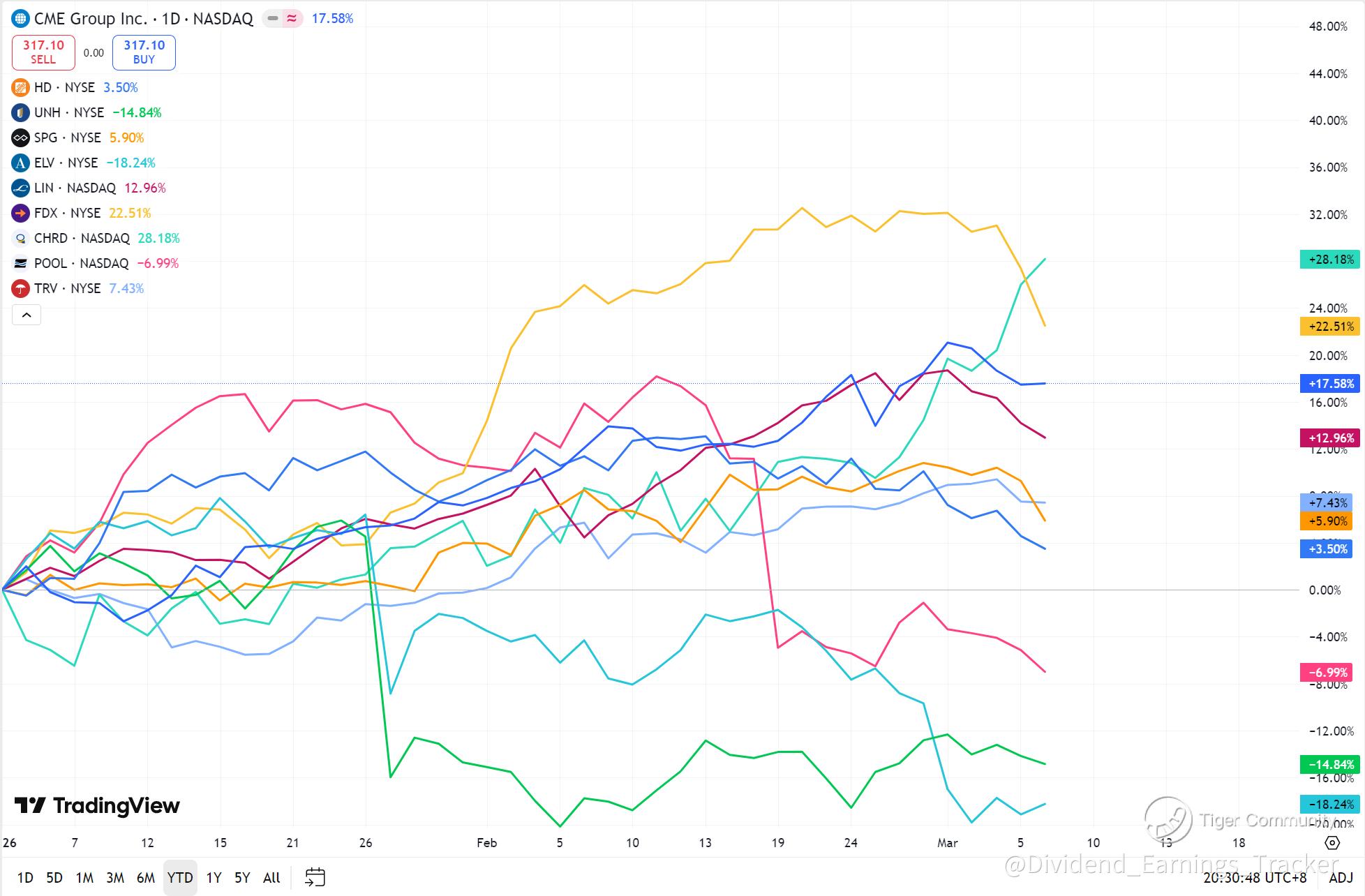According to TradingView’s 2026 figures, $CME Group Inc(CME)$ , $Home Depot(HD)$ , $Simon Property(SPG)$ , $Linde PLC(LIN)$ , $FedEx(FDX)$ , $Chord Energy Corp(CHRD)$ , and $Travelers(TRV)$ registered gains, whereas $UnitedHealth(UNH)$ , $Elevance Health(ELV)$ , and $Pool(POOL)$ moved lower.