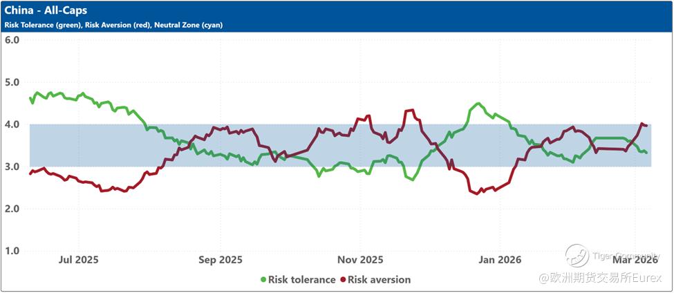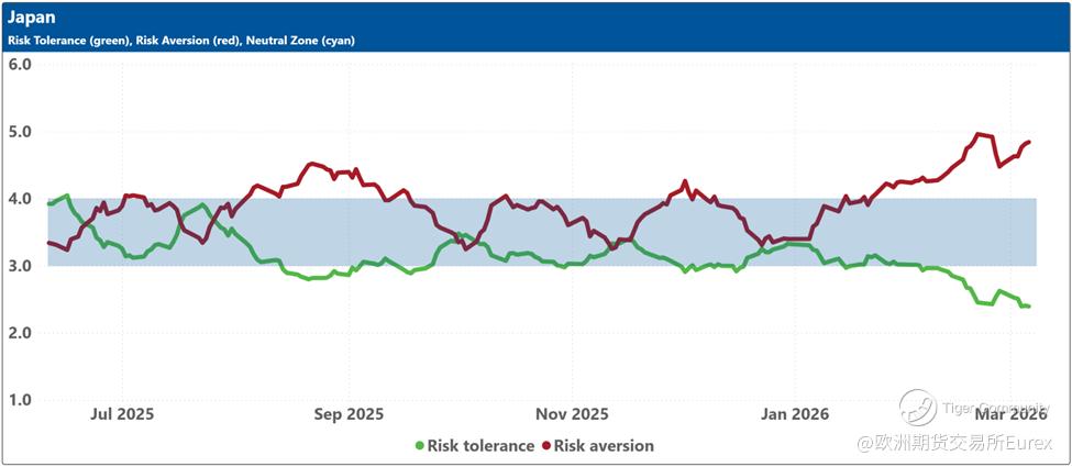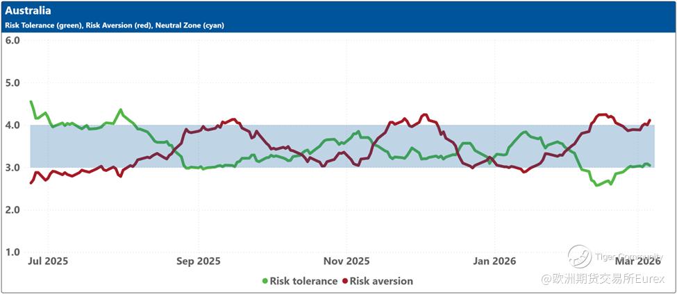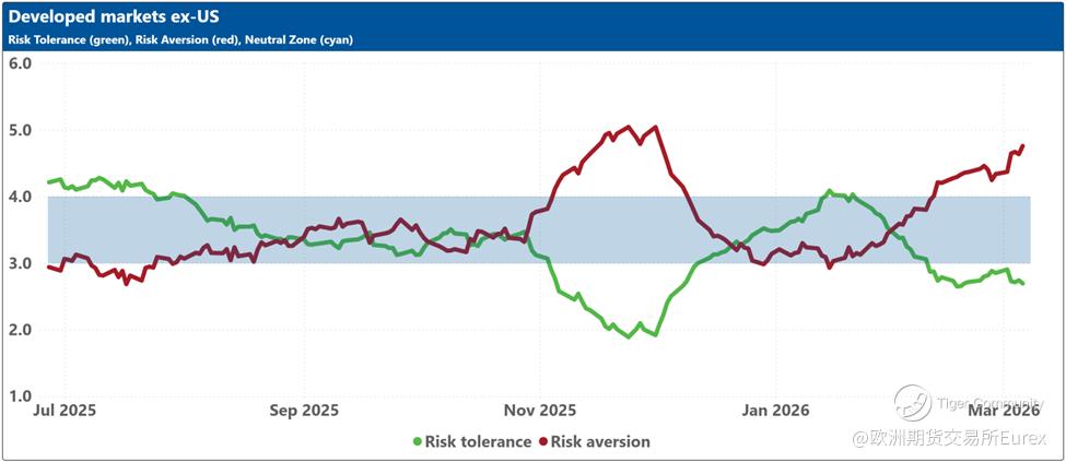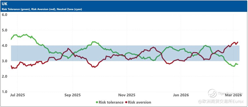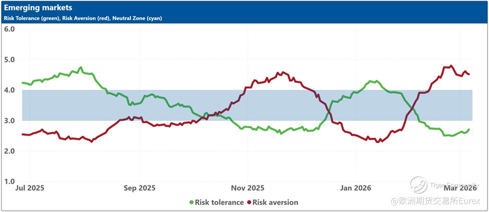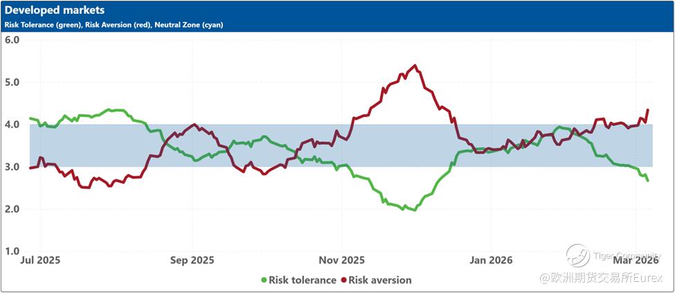 The blue shaded zone between levels 3 and 4 for both indicators signifies a reasonable balance between the supply and demand for risk in the market. When both lines remain within this blue zone, the market is considered ‘emotionally’ stable. However, when both lines move outside this zone, the significant imbalance in demand and supply for risk can lead to overreactions to unexpected news or risk events.