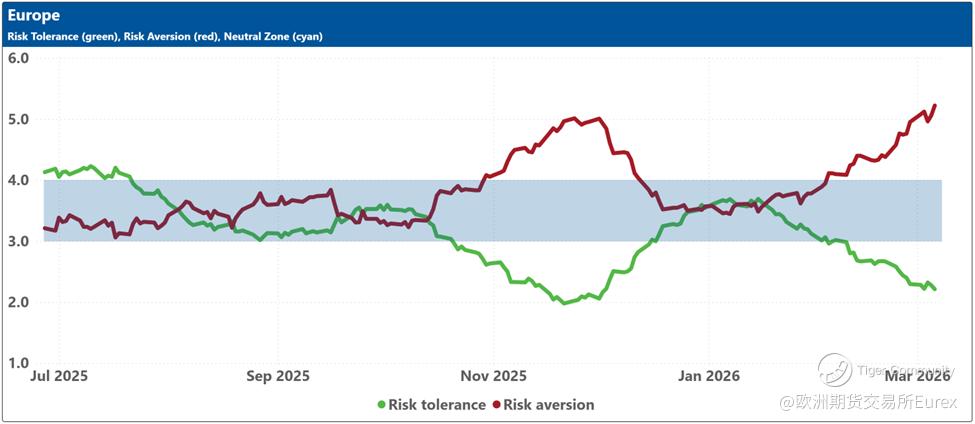The bottom charts display the levels of risk tolerance (green line) and risk aversion (red line) within the market, representing investors' demand and supply for risk, respectively. Key insights include: