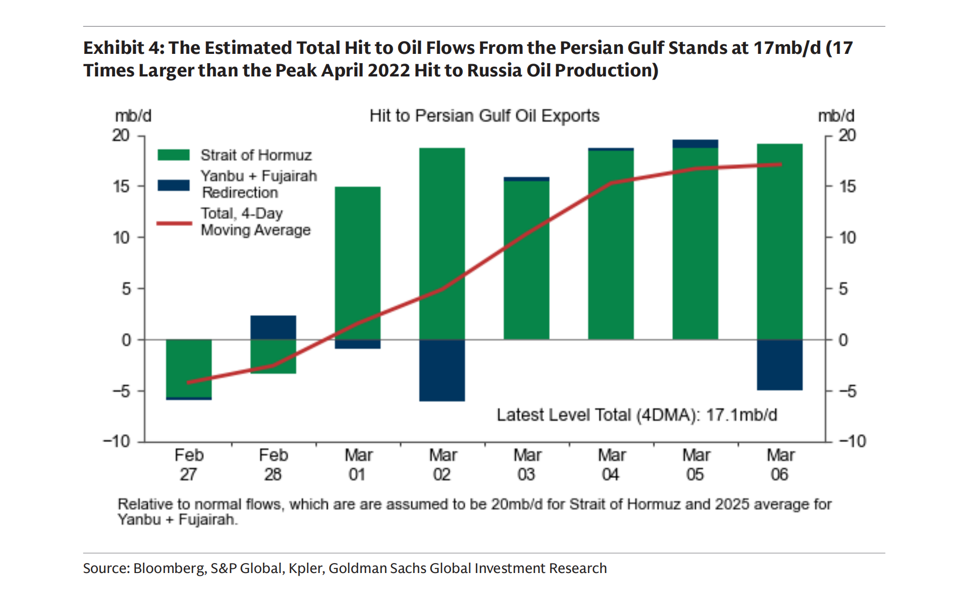 The Strait of Hormuz — carrying roughly 20% of global oil and LNG supply — is effectively shut. Goldman Sachs estimates the total hit to Persian Gulf flows at 17mb/d, a disruption 17 times larger than the peak April 2022 hit to Russian oil production.