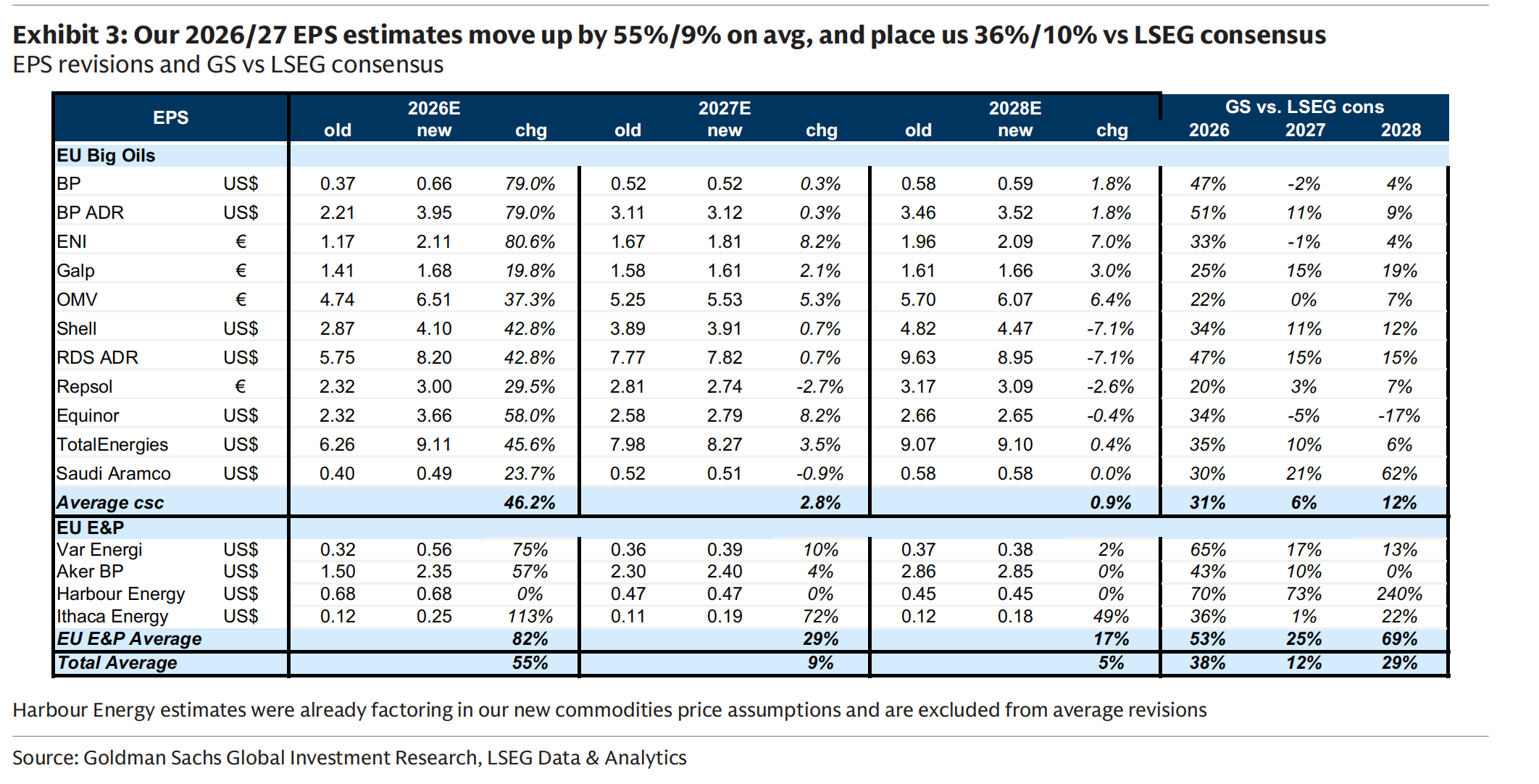 Goldman just raised EU Big Oils 2026 EPS estimates by 55%, placing them 38% above Wall Street consensus — the biggest gap in years. The reason: stock prices are still anchored to old consensus numbers, while Goldman's models now reflect the actual forward curve.